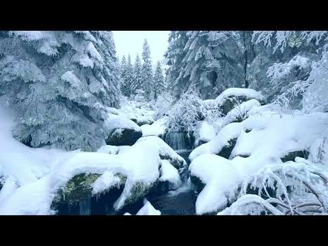 Calming Winter Ambience. Calming River Flowing in Snowy Forest. Backgrou...